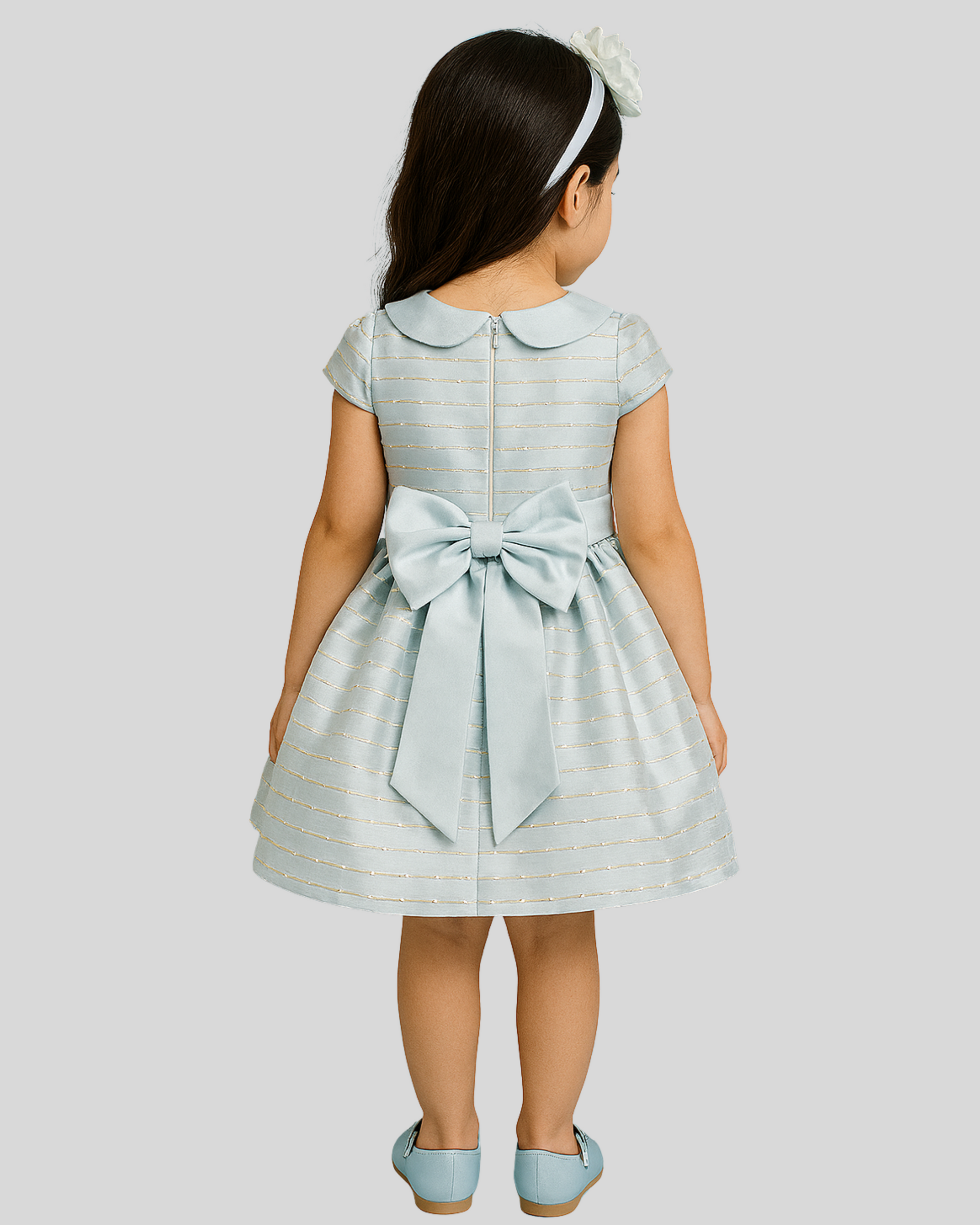 A dreamy pastel blue dress for your little sunshine. Featuring delicate shimmer stripes, soft floral bows, and a matching headband — perfect for birthdays, photoshoots, or just twirling in style.