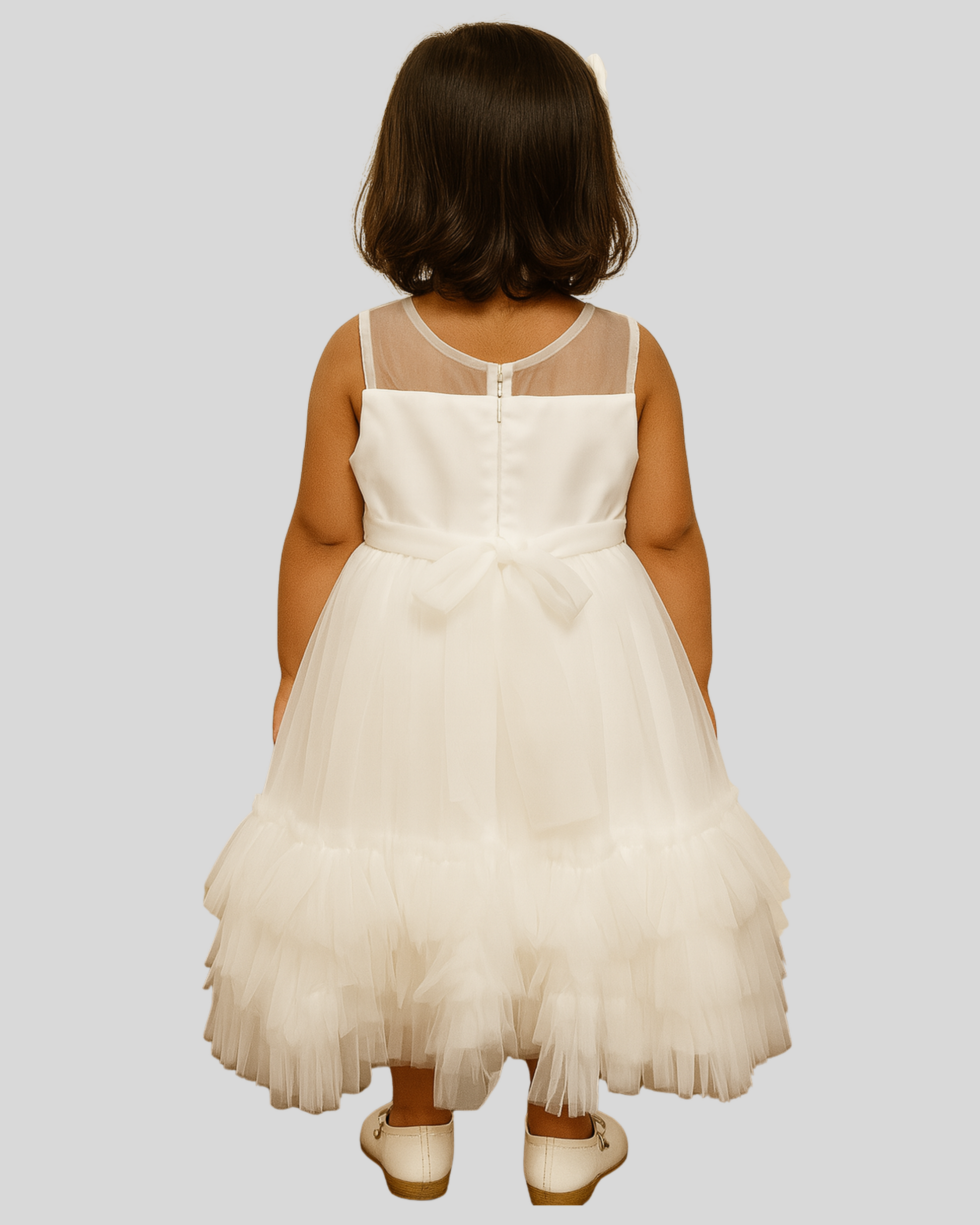 A dreamy white tulle gown layered with soft cascading ruffles and finished with a sparkly waistband. Perfect for special occasions and twirls!