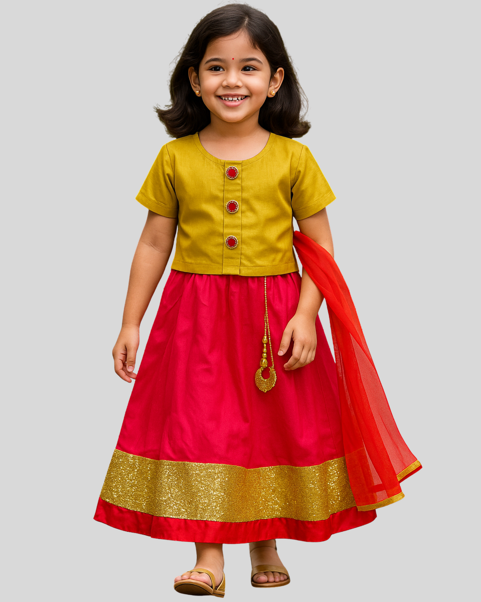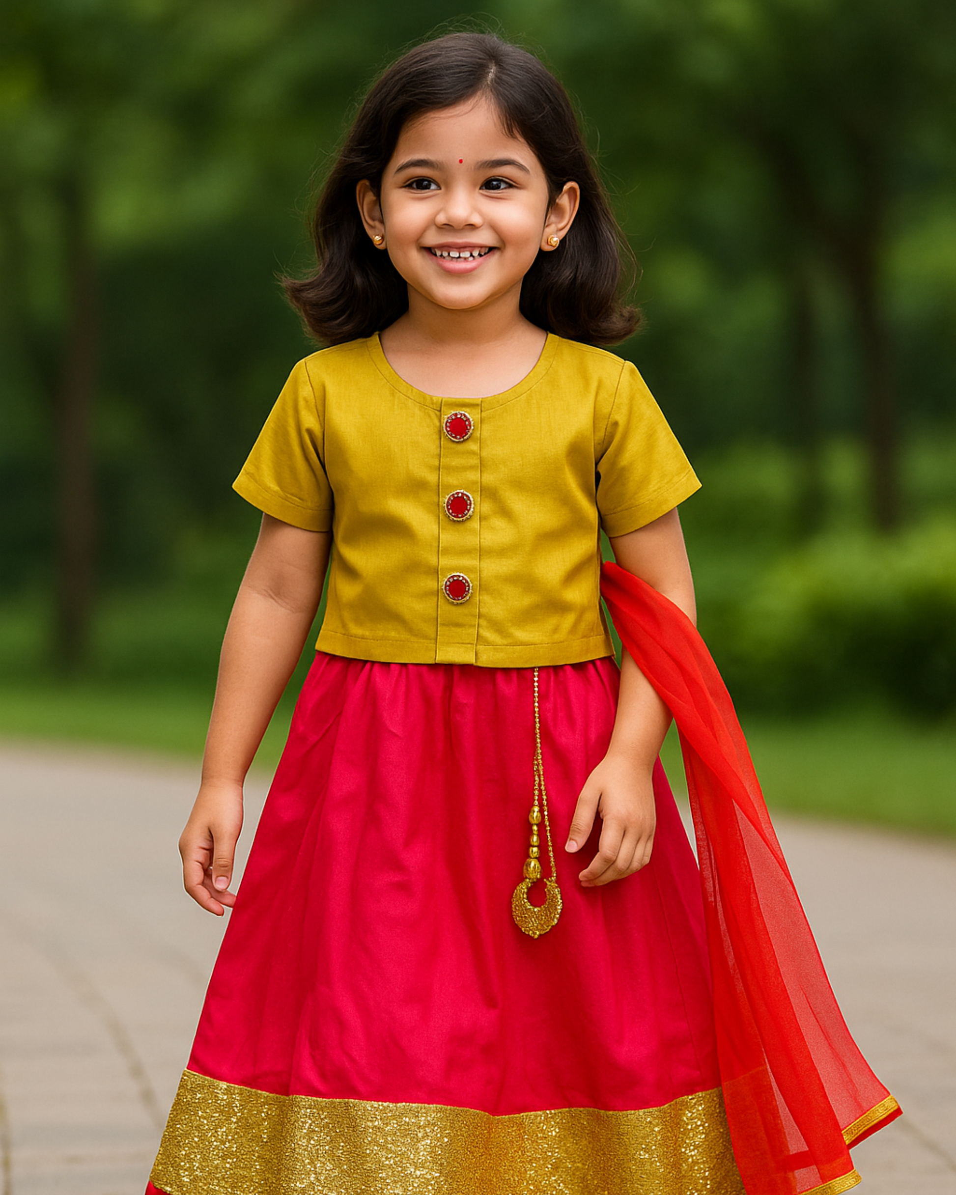 Brighten up your little girl’s festive wardrobe with our Gulnaar Glam Lehenga Set. This 3-piece ensemble in vibrant shades of rani pink, mustard yellow, and gold glitter makes a stunning ethnic statement for weddings, Navratri, or any celebration.