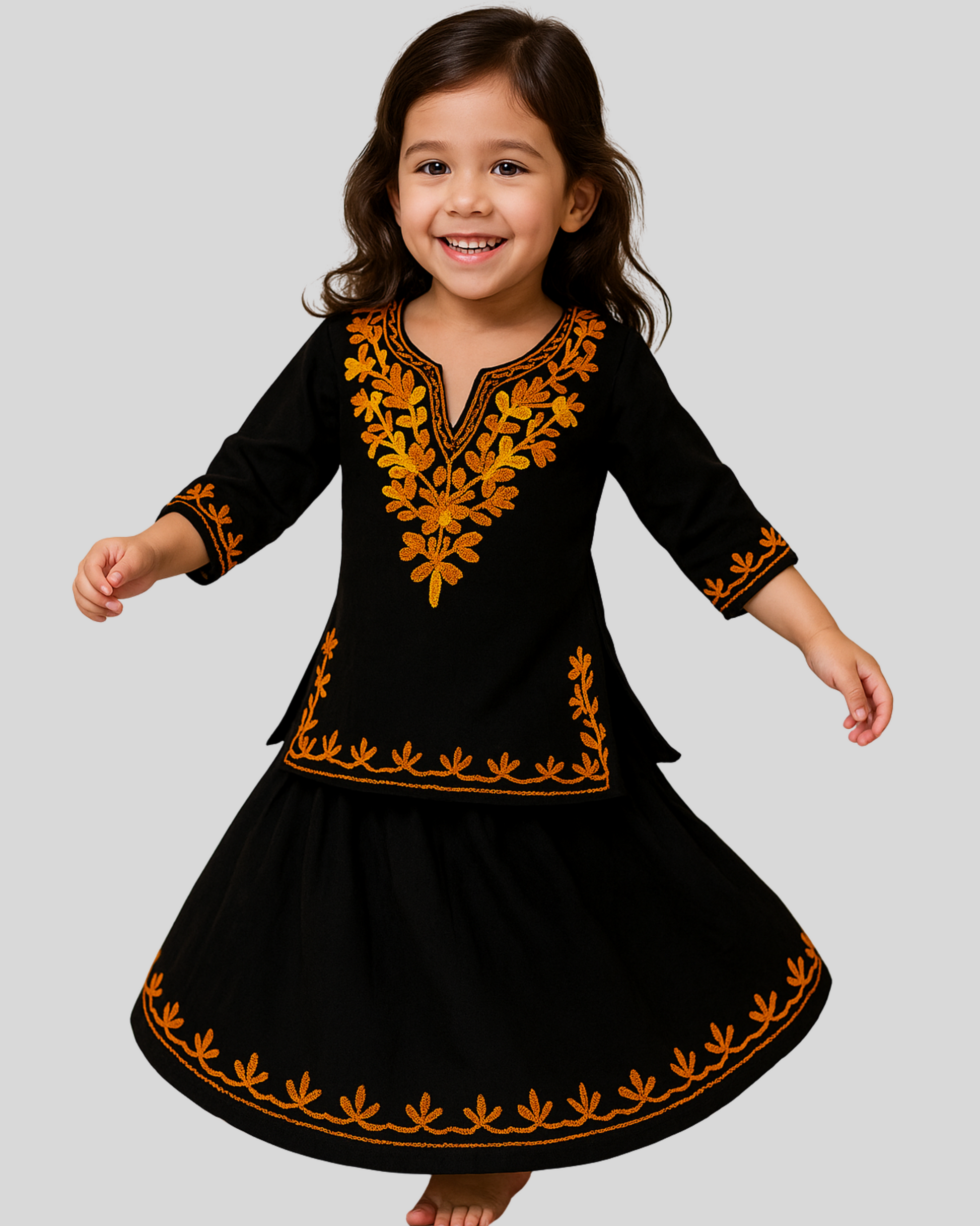 An elegant black kurti with radiant orange and yellow floral embroidery. This 3/4th sleeve piece combines ethnic charm with festive flair, perfect for special occasions.