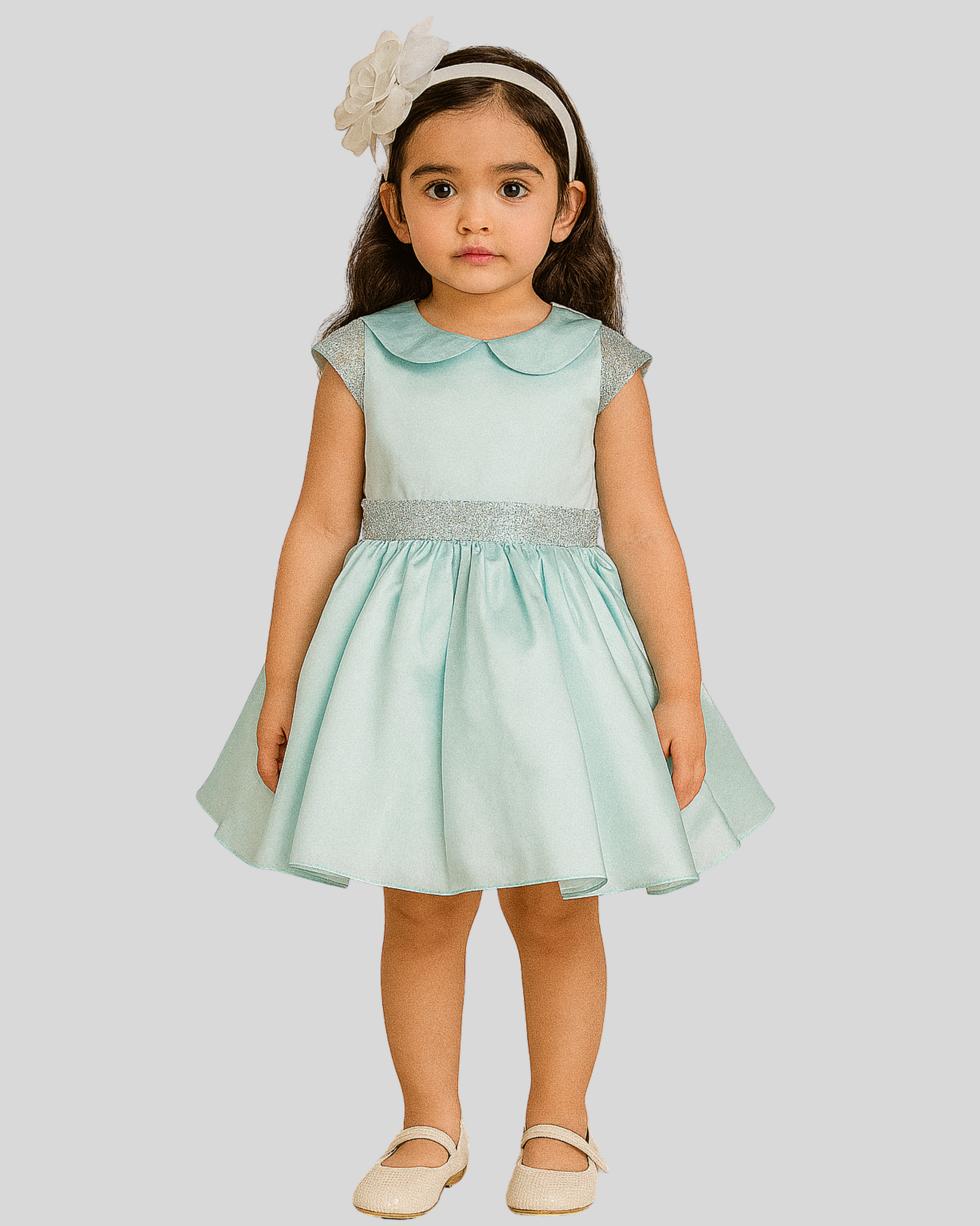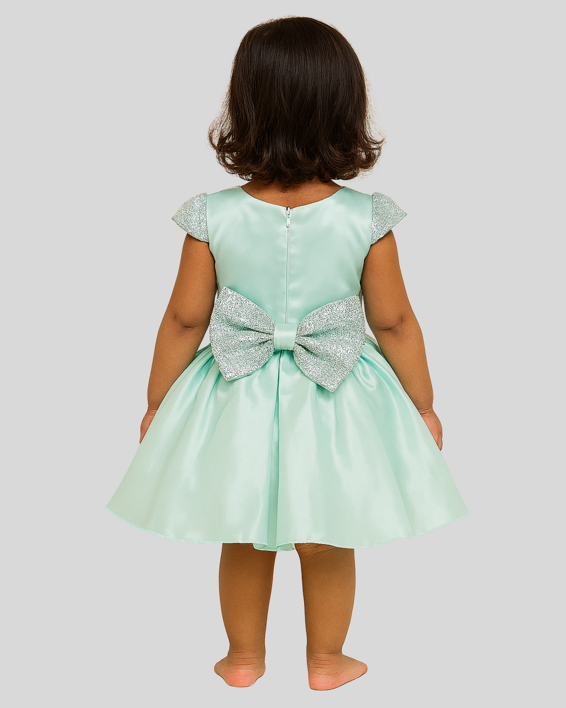 Let your little one twirl in magic with this mint green party dress, designed with shimmering silver details and a graceful bow. A perfect blend of charm and elegance.