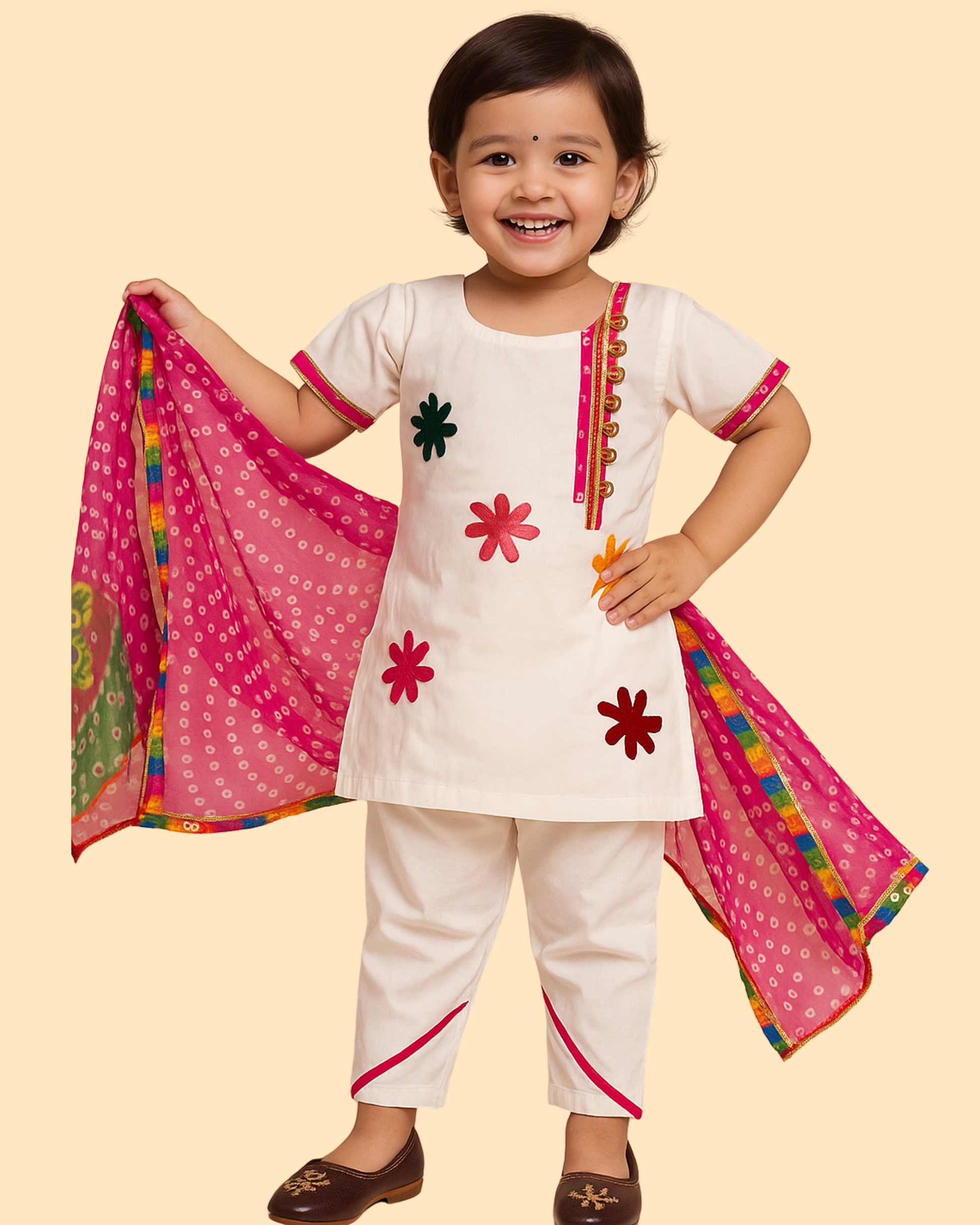 A vibrant celebration of Indian tradition, this 3-piece ethnic set in soft white cotton features playful applique flowers, contrast pink piping, and a colorful bandhani dupatta. Perfect for festive twirls and cultural days!