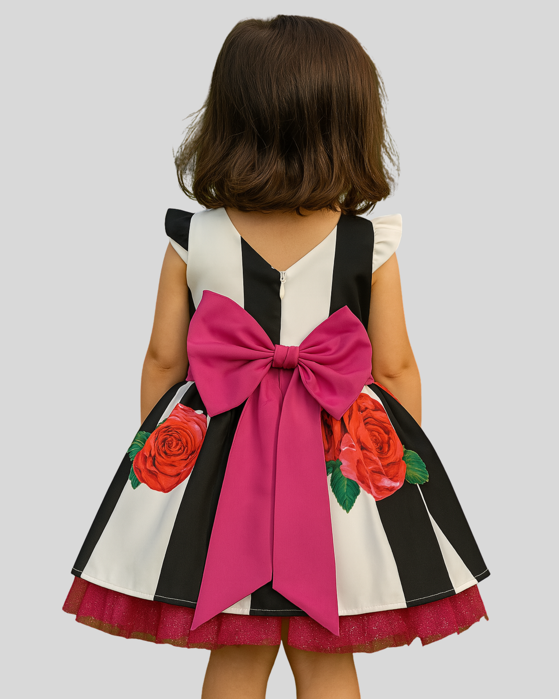 A delightful blend of bold and blooming! This sleeveless dress features classic black-and-white vertical stripes adorned with vibrant red rose prints. Accentuated with a pink satin bow belt and a floral applique on the shoulder, it’s perfect for birthdays and special outings.