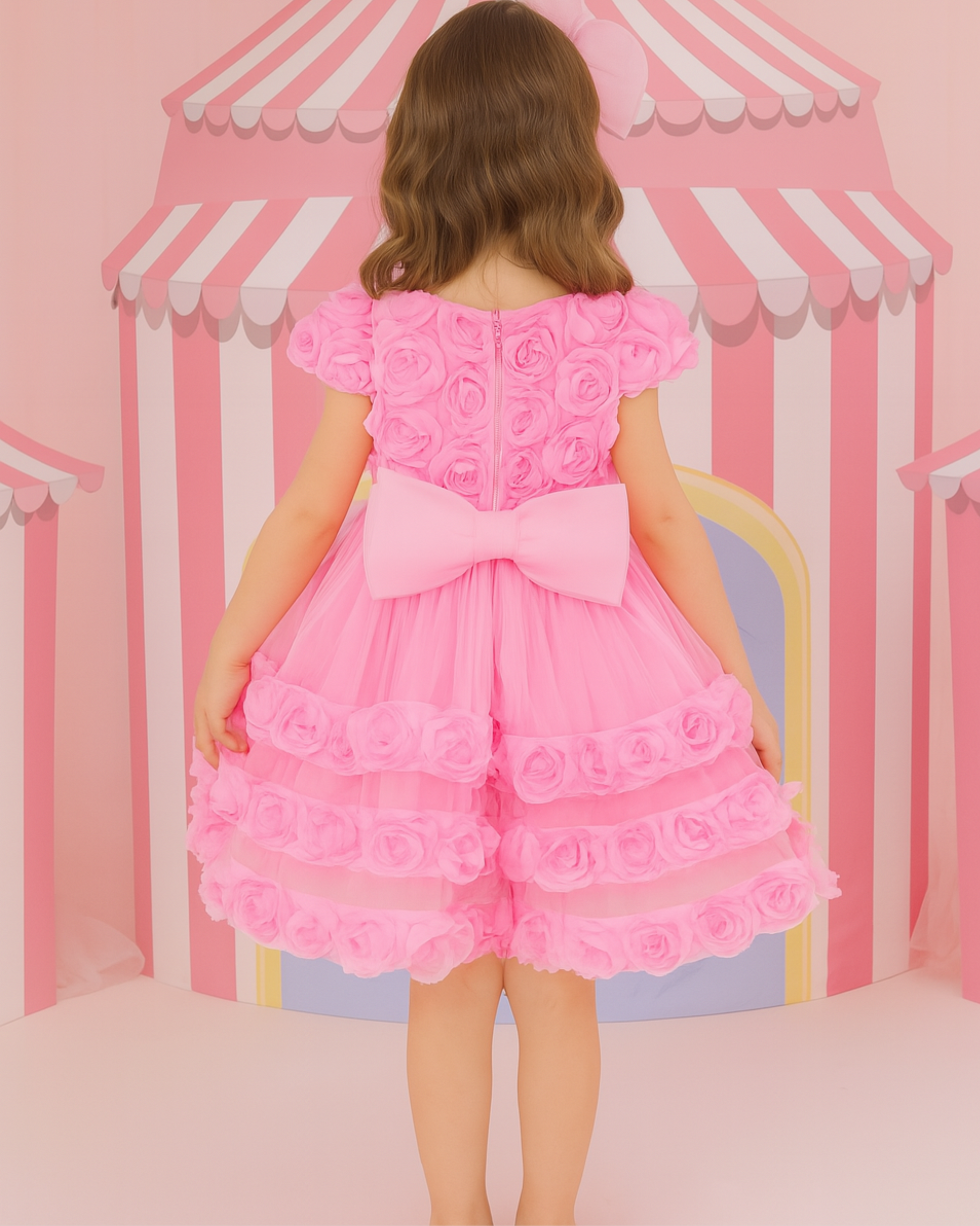 A dreamy explosion of pink rosettes, this frock is the perfect pick for your little fashionista. With layers of floral frills and a voluminous silhouette, it's made for twirling through parties and birthdays.