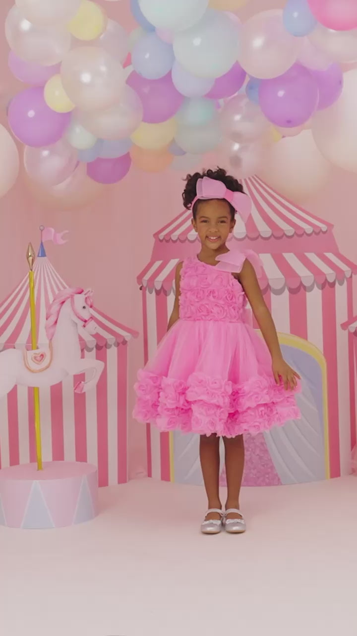A garden of roses in every twirl! This all-over rosette dress in soft pink is the perfect fairytale frock for your little one. Paired with a dreamy tulle bow and matching headband, it’s made for magical memories.