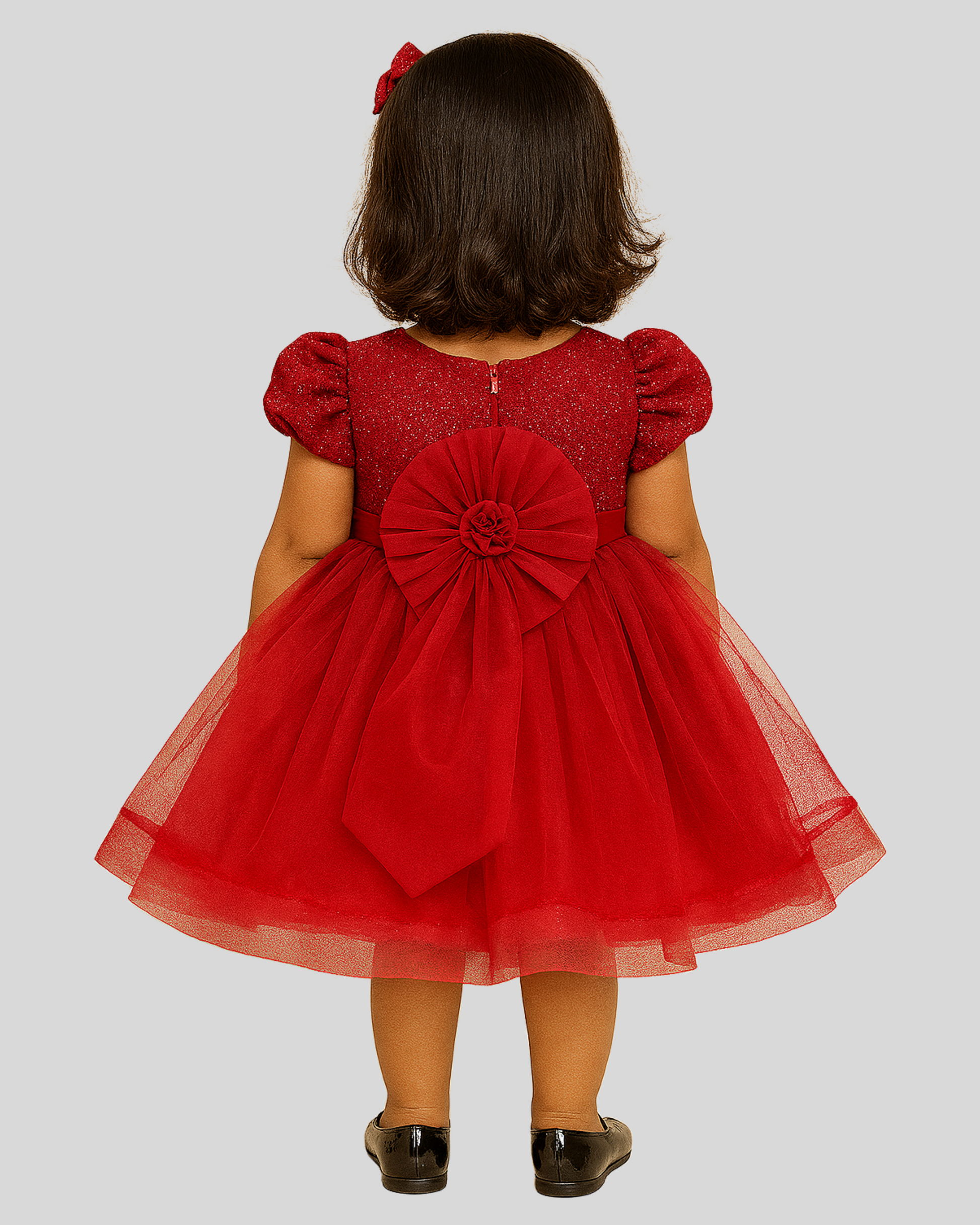 Let your little one shine bright in this stunning ruby red party dress. With a glittery bodice, puff sleeves, and a full tulle skirt adorned with dainty rosettes and a charming back bow, it's the perfect pick for birthdays or festive occasions. Comes with a matching floral bow clip to complete the look!