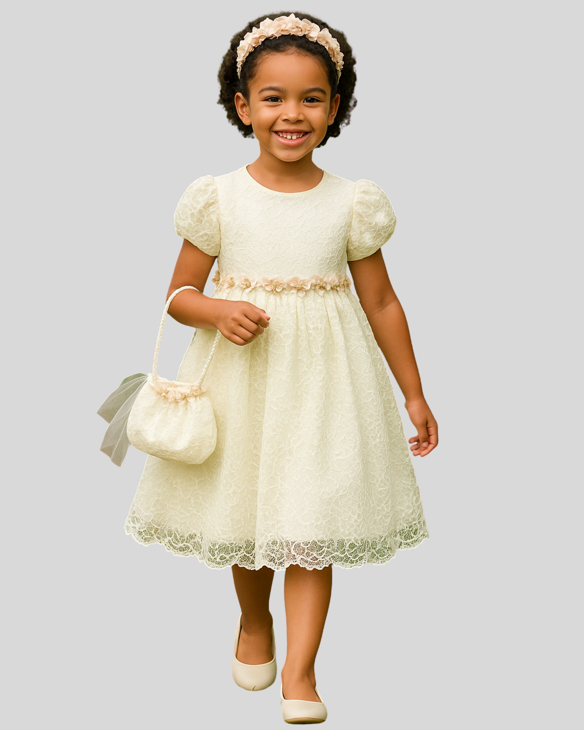 A dreamy ivory lace dress set adorned with soft floral accents, perfect for your little one's special moments. Comes with a matching floral headband and elegant sling bag.