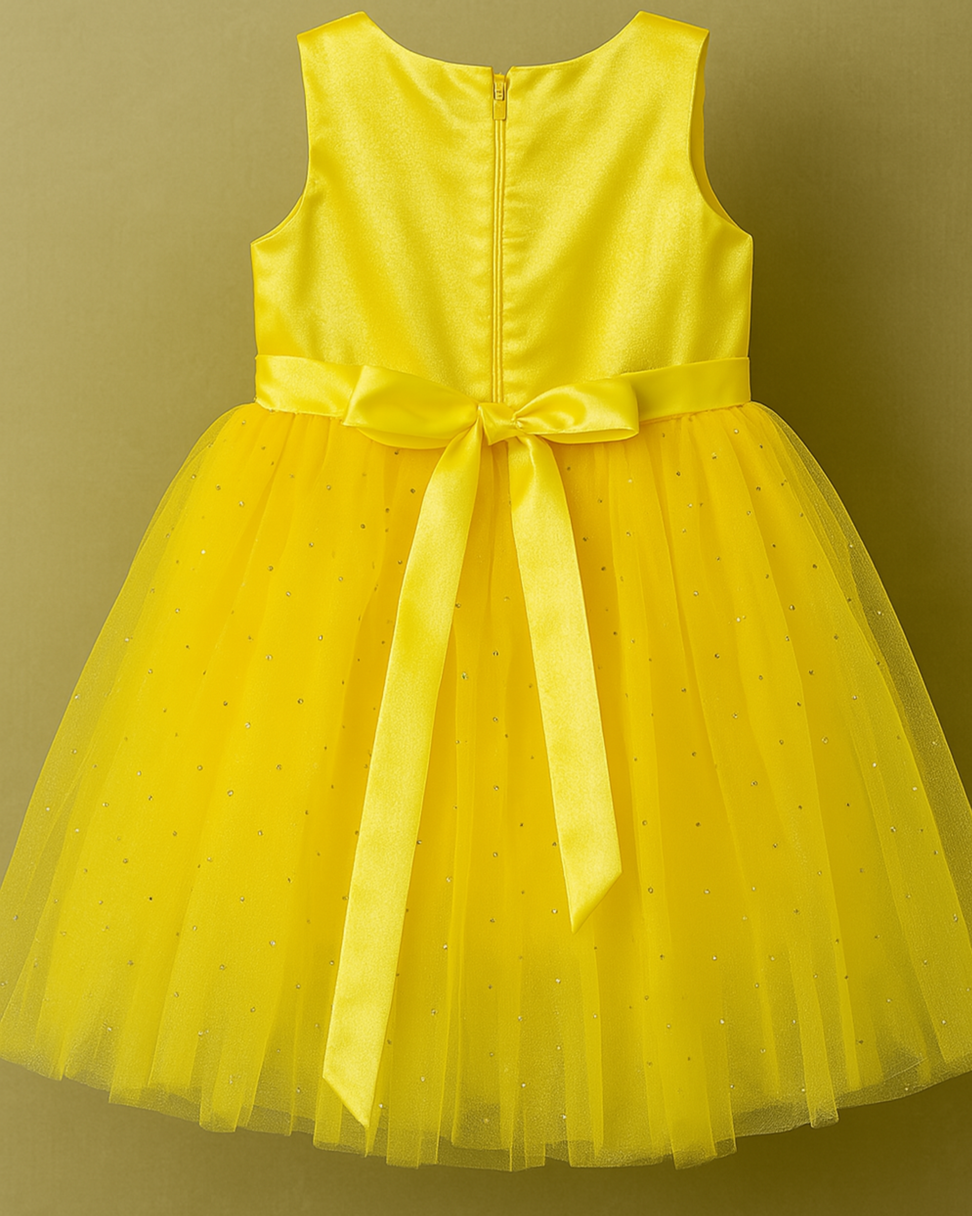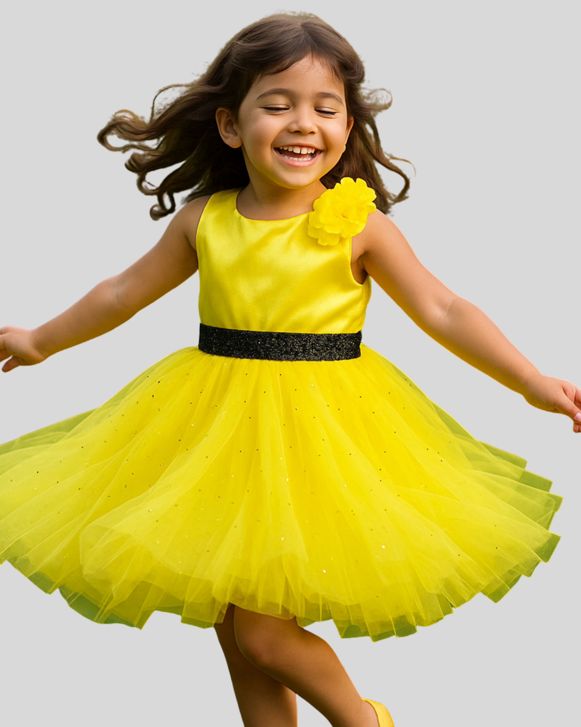 Brighten up every celebration with this vibrant yellow party dress, featuring a glossy satin bodice, glitter waistband, and a soft tulle skirt embellished with tiny sparkles. Complete with a flower detail on the shoulder for extra charm!