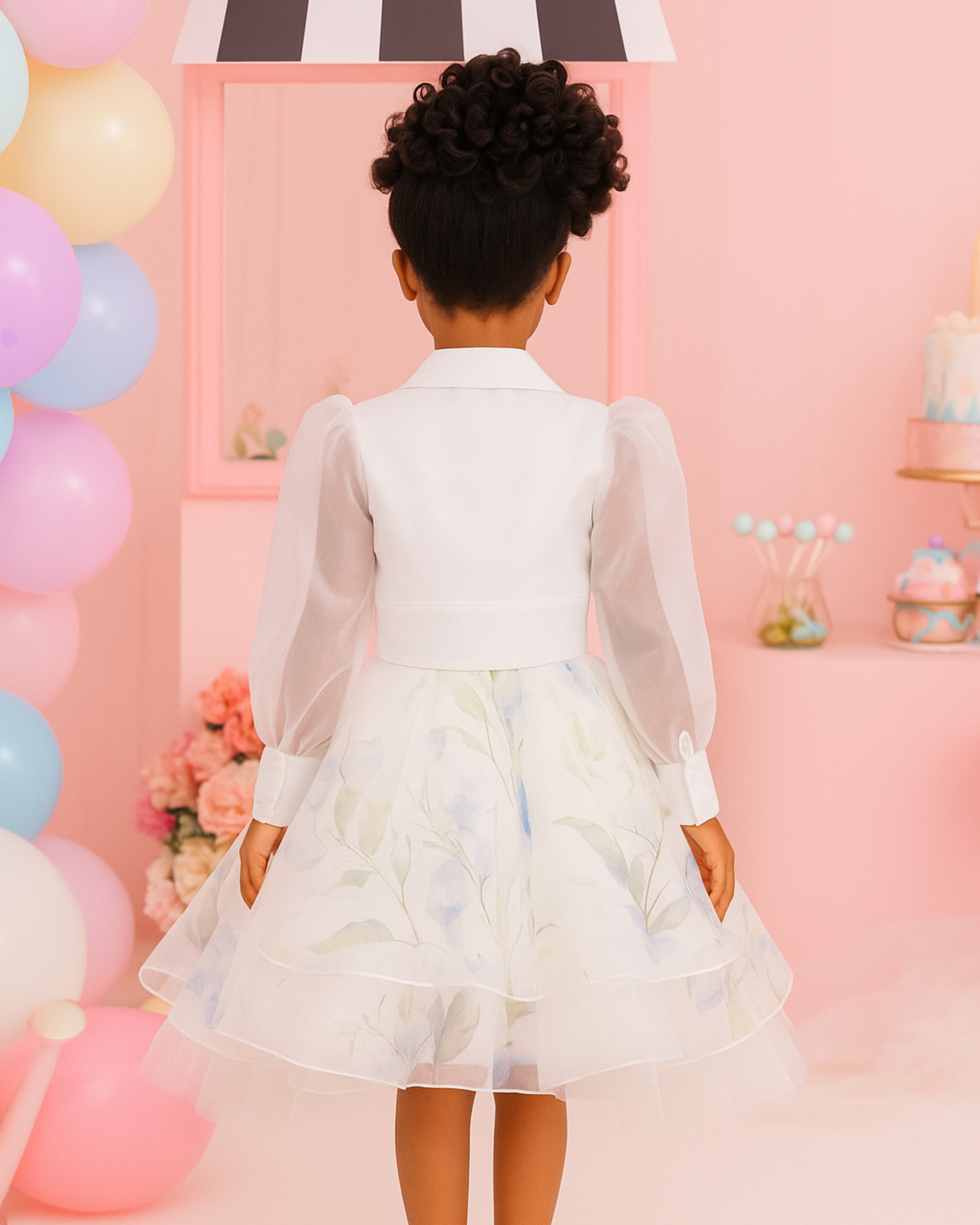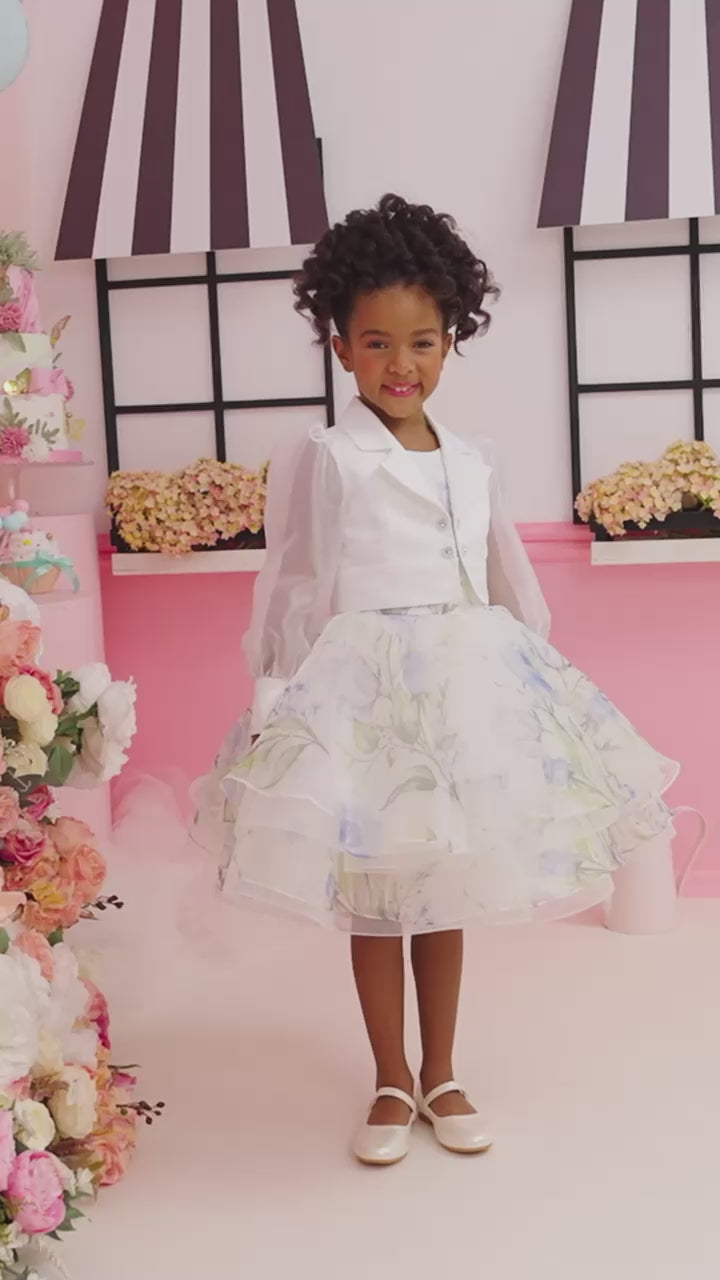 A charming floral printed party dress paired with a structured white blazer. This elegant piece is perfect for cooler evenings and special occasions.